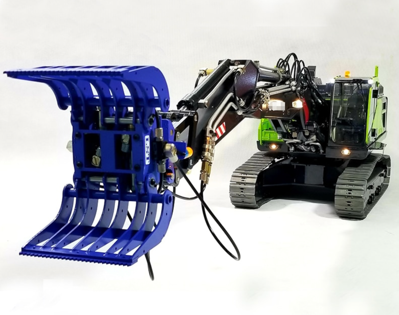 - Das Baggermodell besteht zu 90 % aus Metall (einschließlich Hauptarm, Mittelarm, kleiner Arm, Schaufel, Stützbeine, Planierschild, Achsen usw.). Das Fahrzeug ist mit Scheinwerfern am Mittelarm ausgestattet.